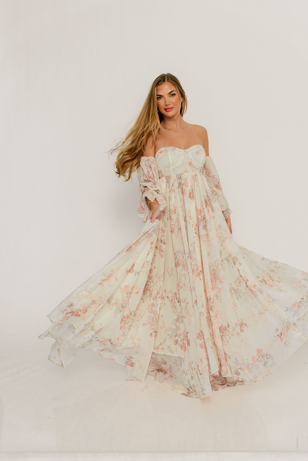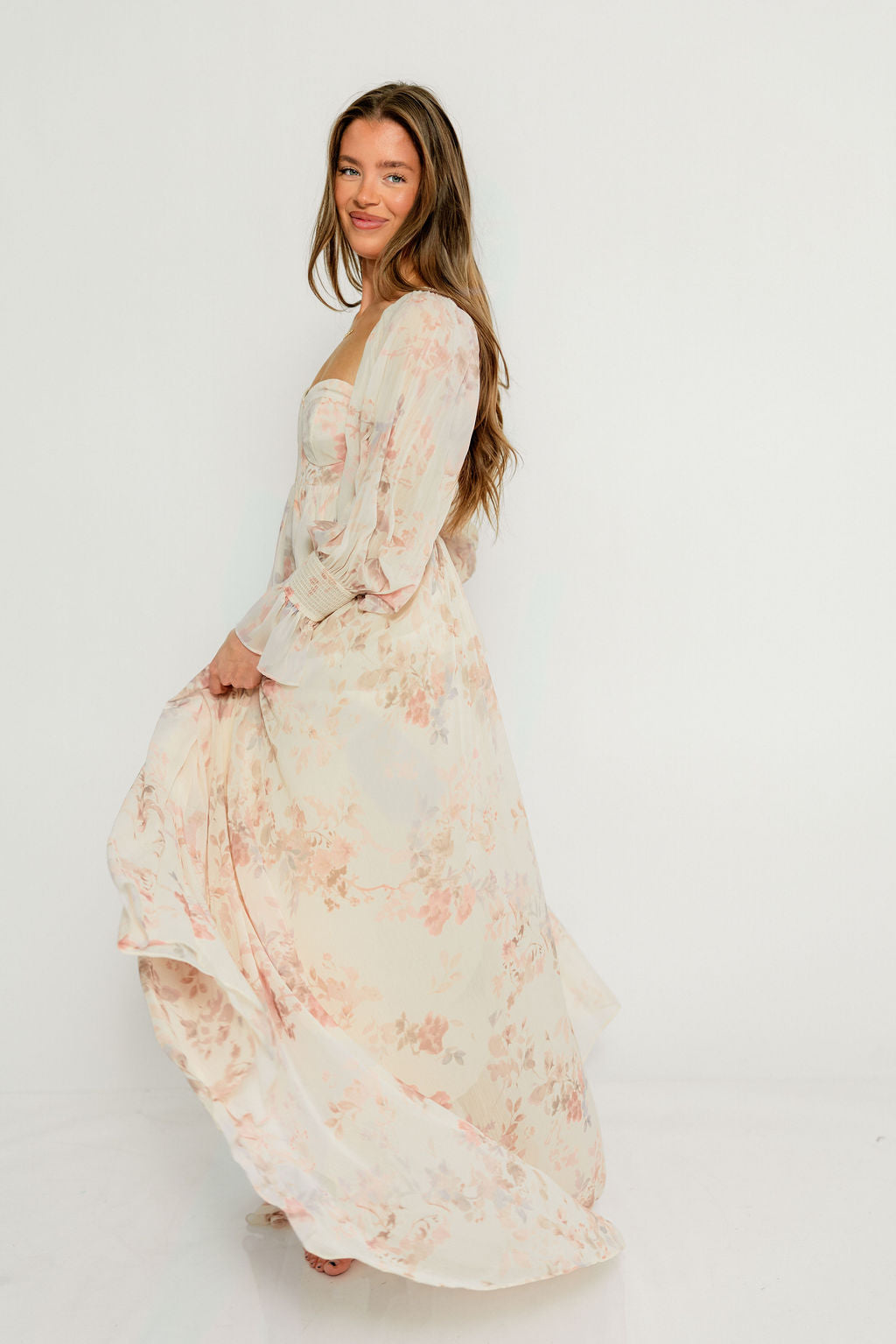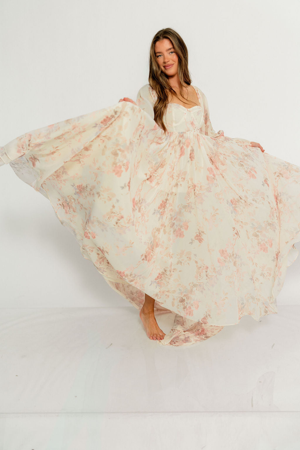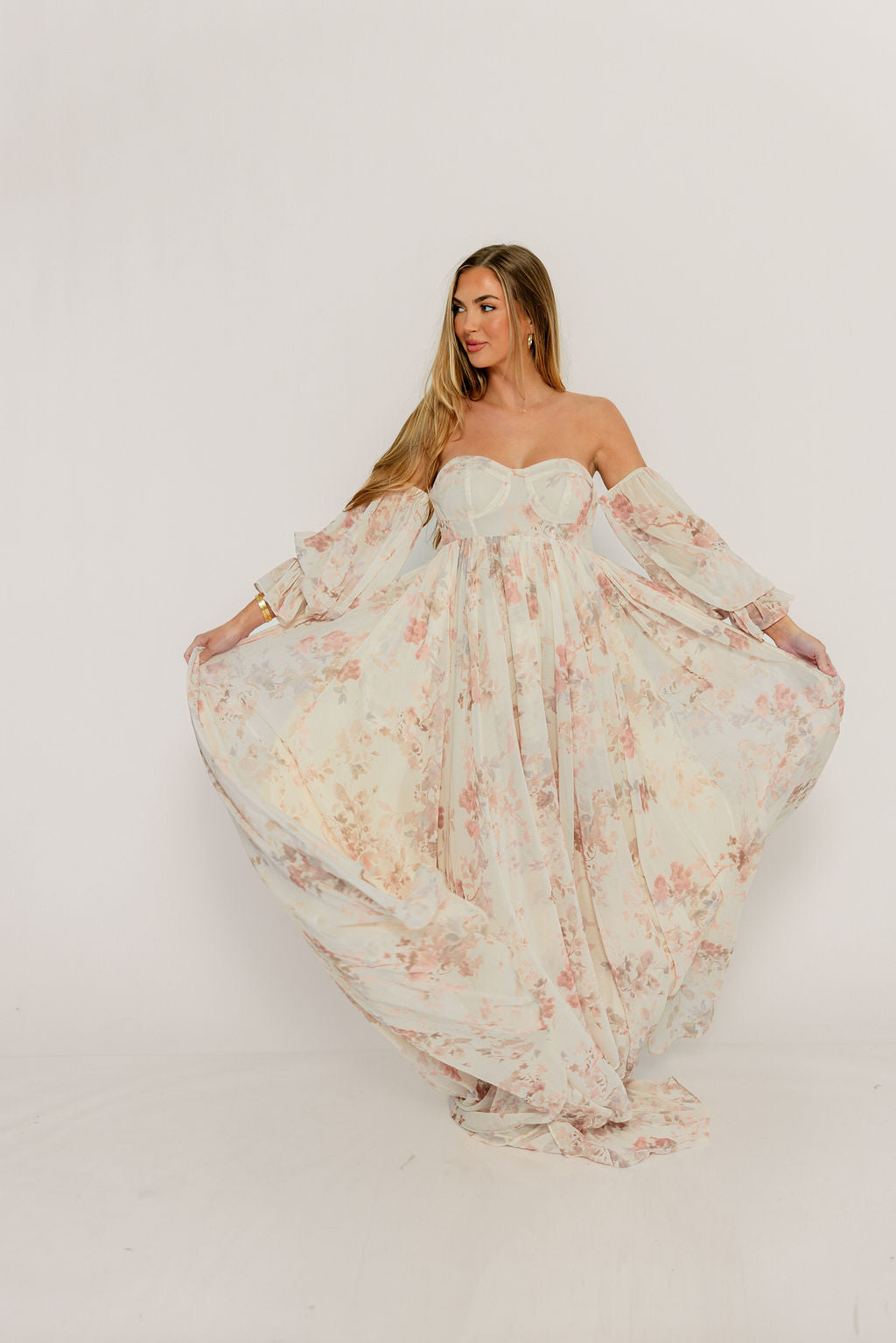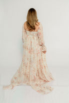 GARMENT DETAILS: Premium floral maxi dress in a lightweight, shirred chiffon. Features a soft bustier-style bodice (no boning), sweetheart neckline, smocked back panel, and sheer long sleeves with elastic cuffs and ruffles. Sleeves can be worn on or off the shoulder. Finished with a sweeping maxi-length skirt and dramatic train. Lined.