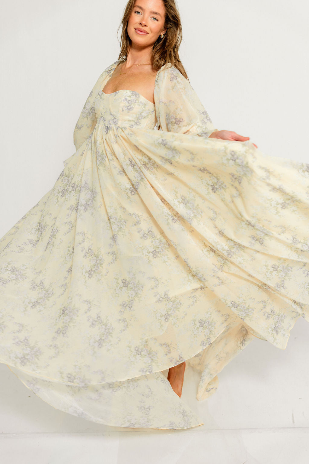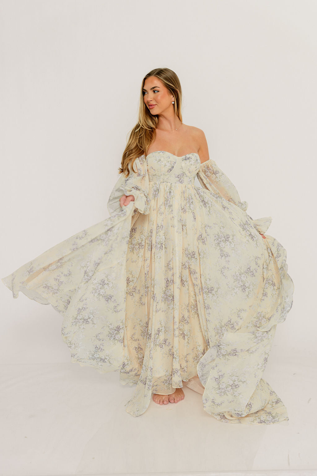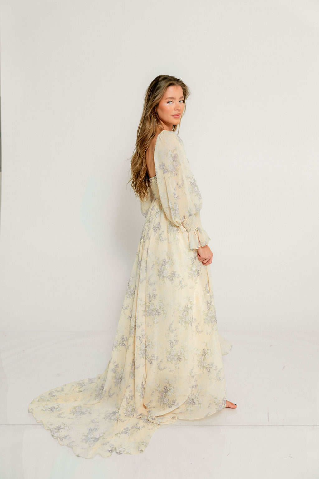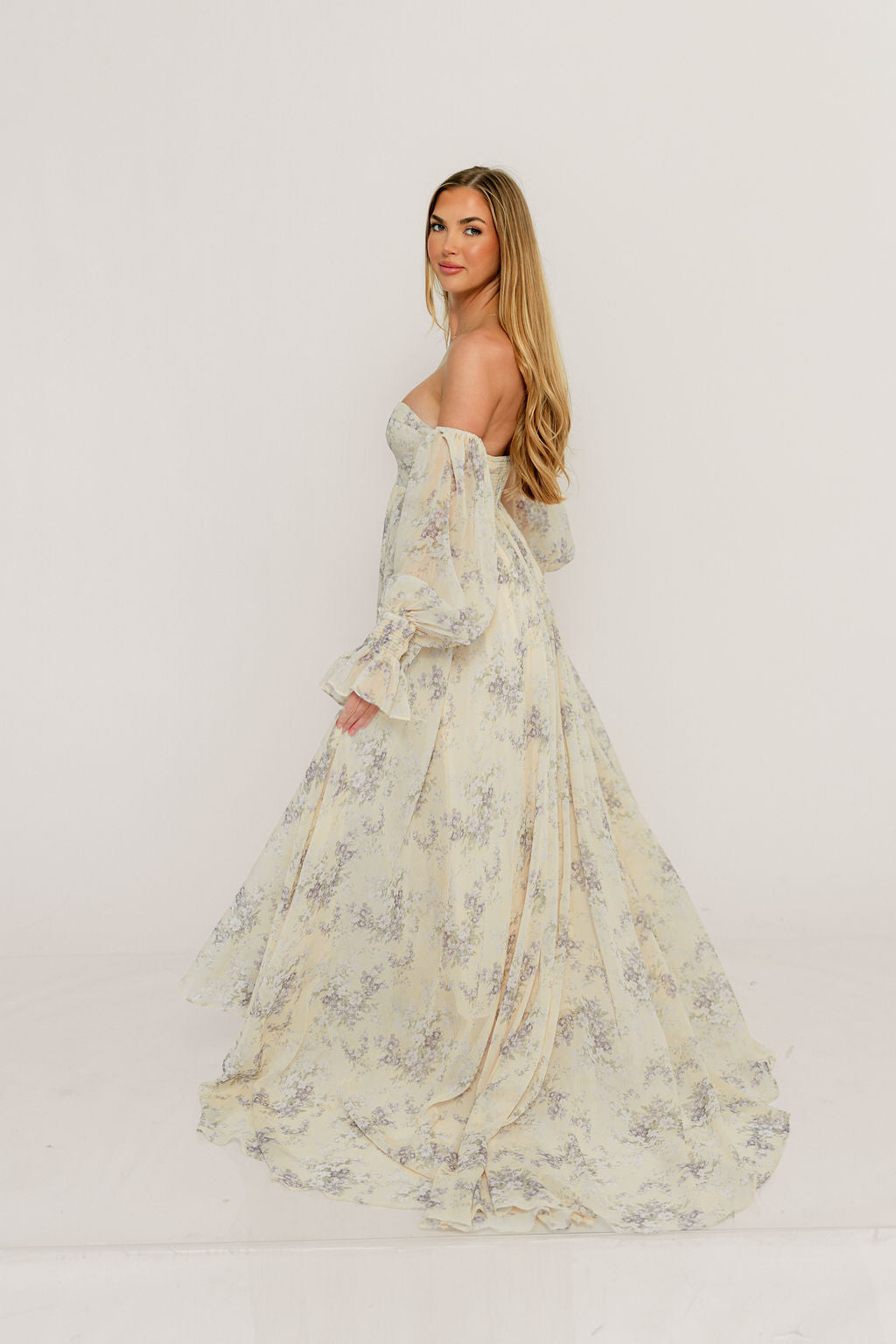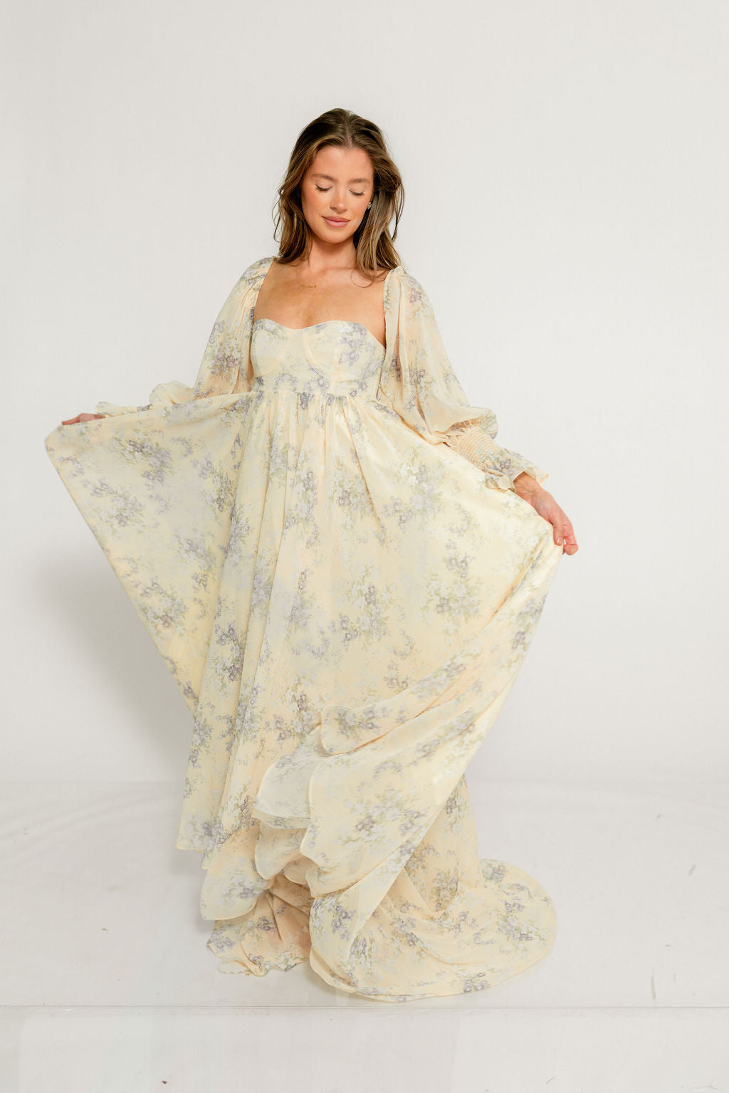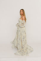 GARMENT DETAILS: Premium floral maxi dress in a lightweight, shirred chiffon. Features a soft bustier-style bodice (no boning), sweetheart neckline, smocked back panel, and sheer long sleeves with elastic cuffs and ruffles. Sleeves can be worn on or off the shoulder. Finished with a sweeping maxi-length skirt and dramatic train. Lined.