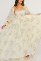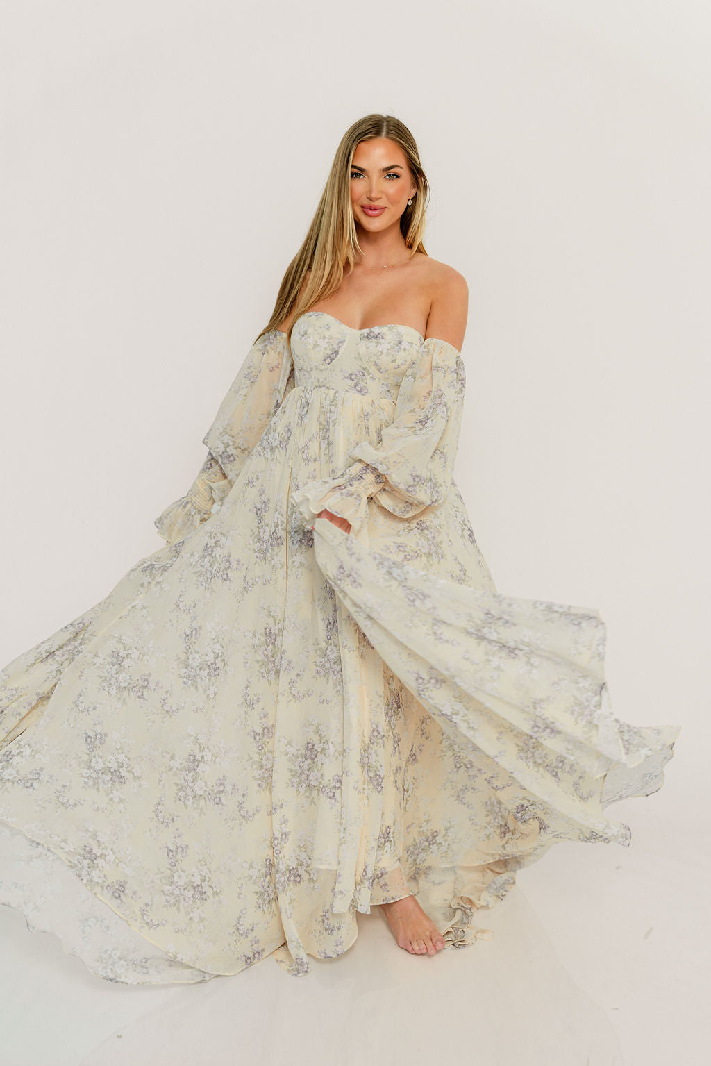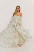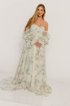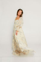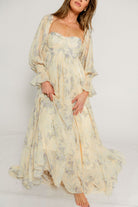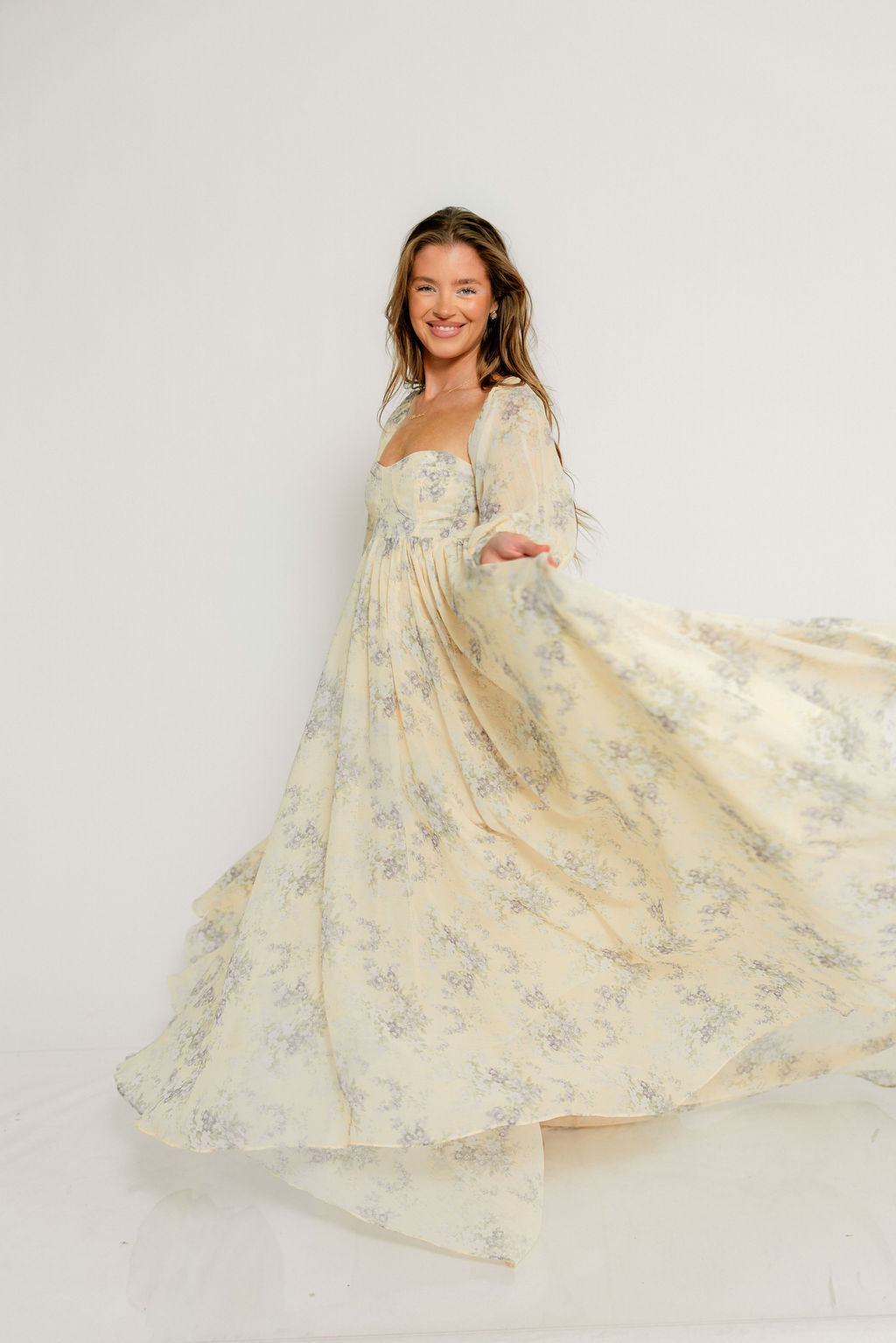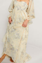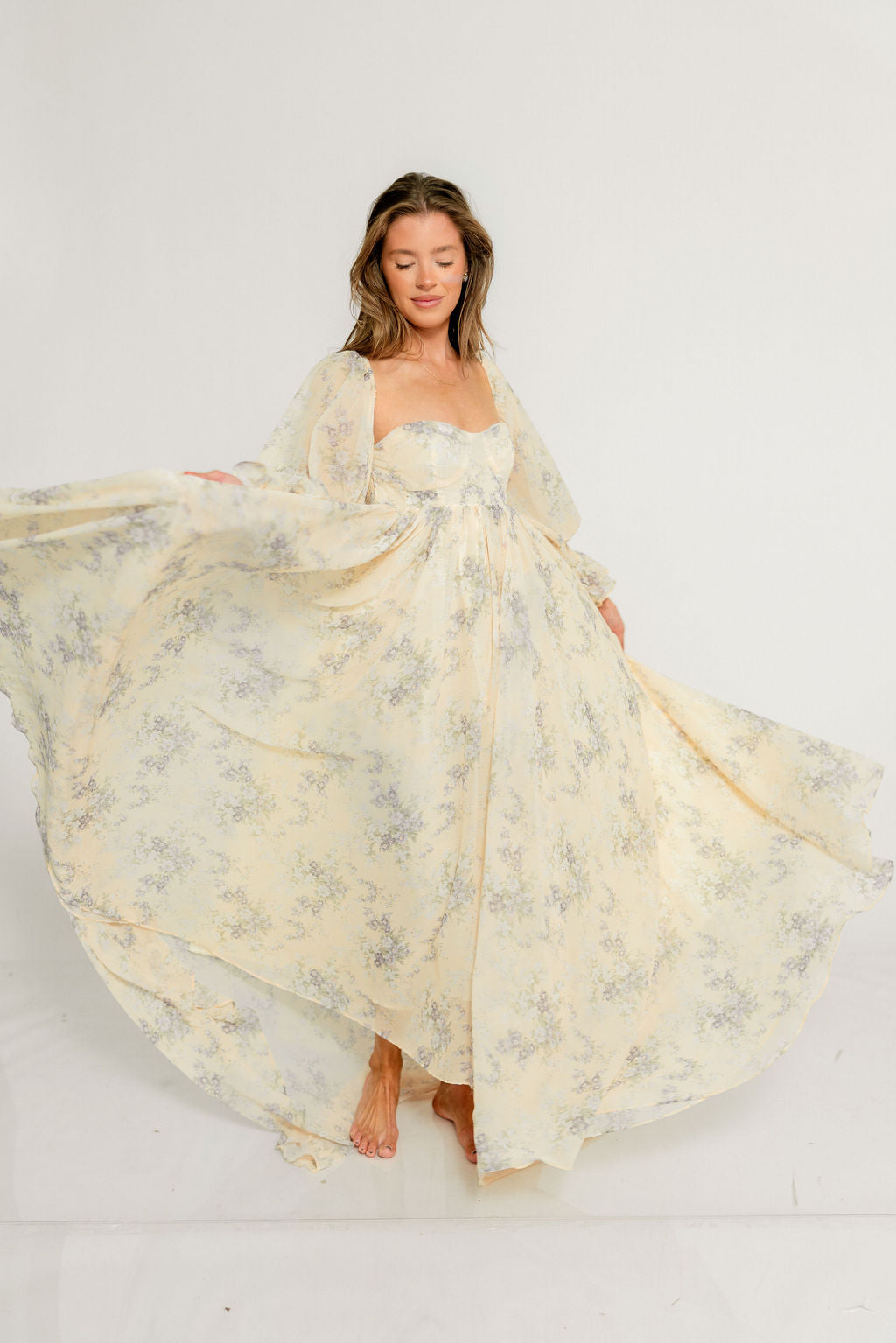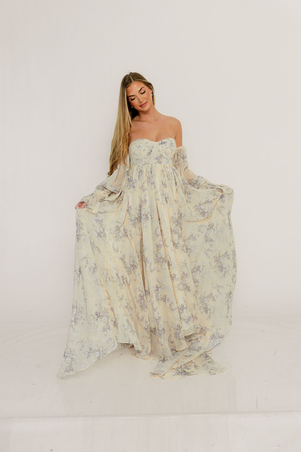 GARMENT DETAILS: Premium floral maxi dress in a lightweight, shirred chiffon. Features a soft bustier-style bodice (no boning), sweetheart neckline, smocked back panel, and sheer long sleeves with elastic cuffs and ruffles. Sleeves can be worn on or off the shoulder. Finished with a sweeping maxi-length skirt and dramatic train. Lined.