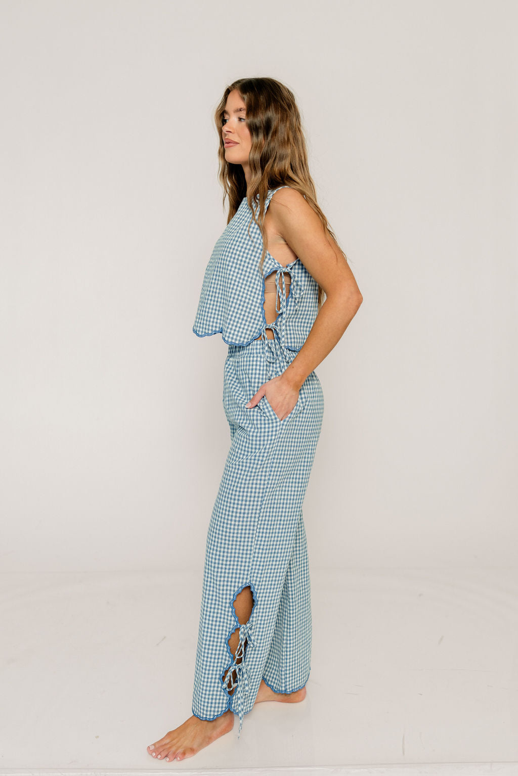 GARMENT DETAILS: Charming gingham-print pants with elasticated waistband, wide-leg silhouette, and adjustable side ties at the hem. Features contrast color trim and dual side pockets.