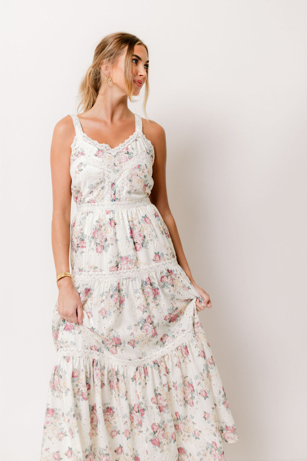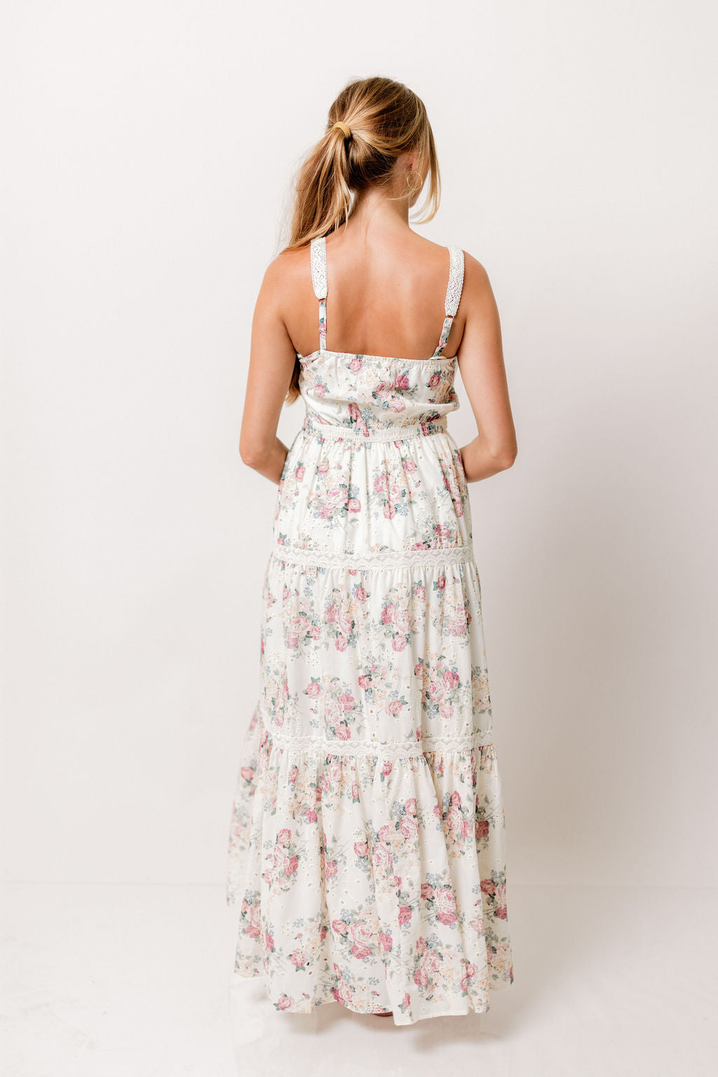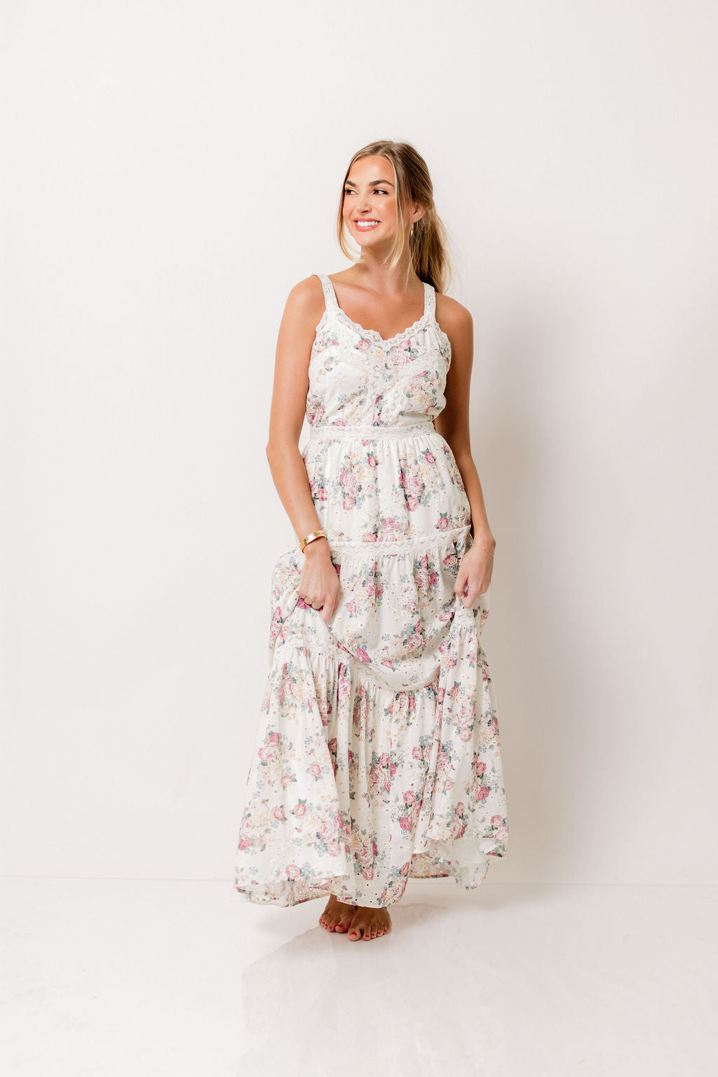 GARMENT DETAILS: Elegant and lightweight maxi dress in a feminine floral print, with V-neckline and delicate lace details. Features a multi-tiered skirt and lightweight, airy silhouette.