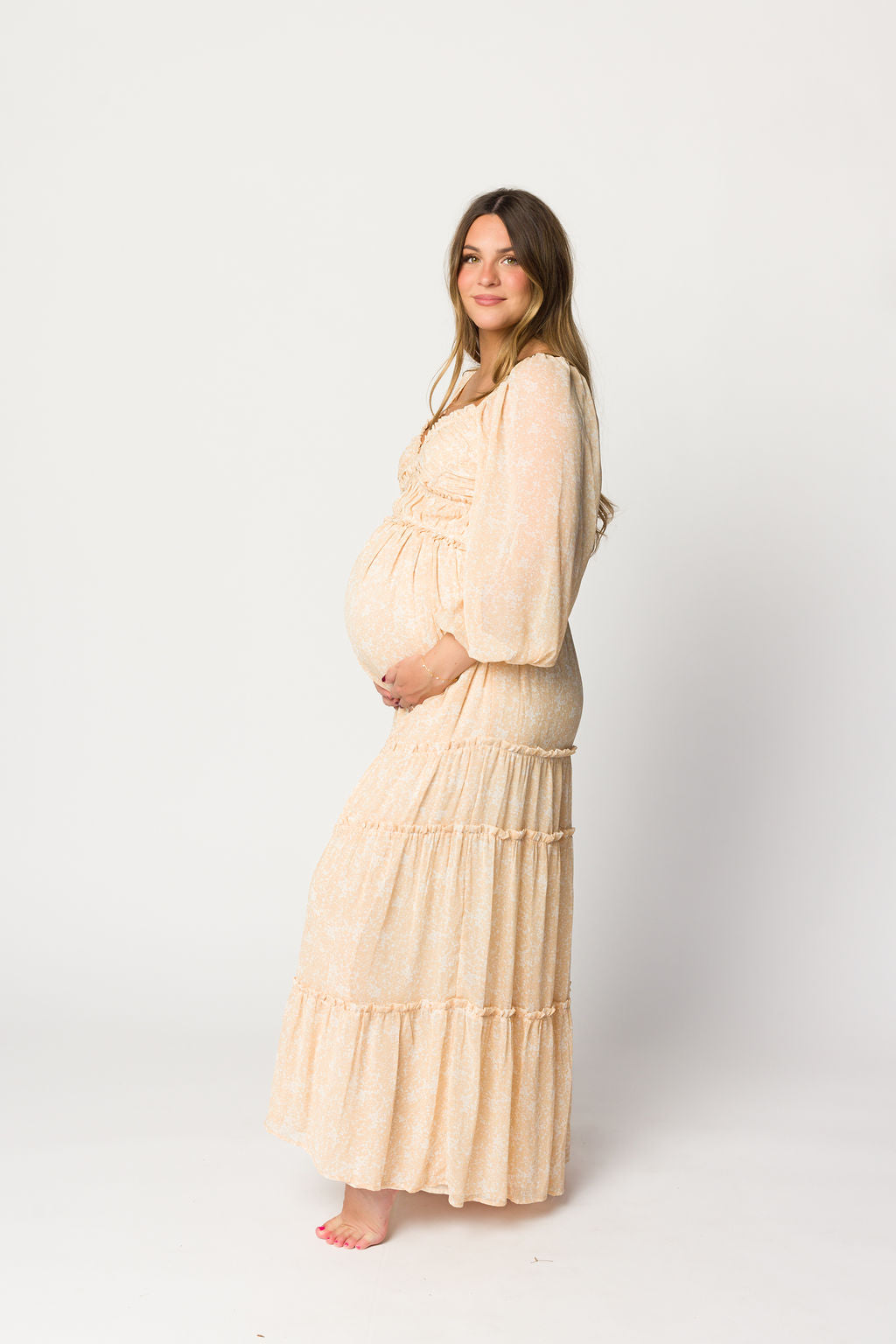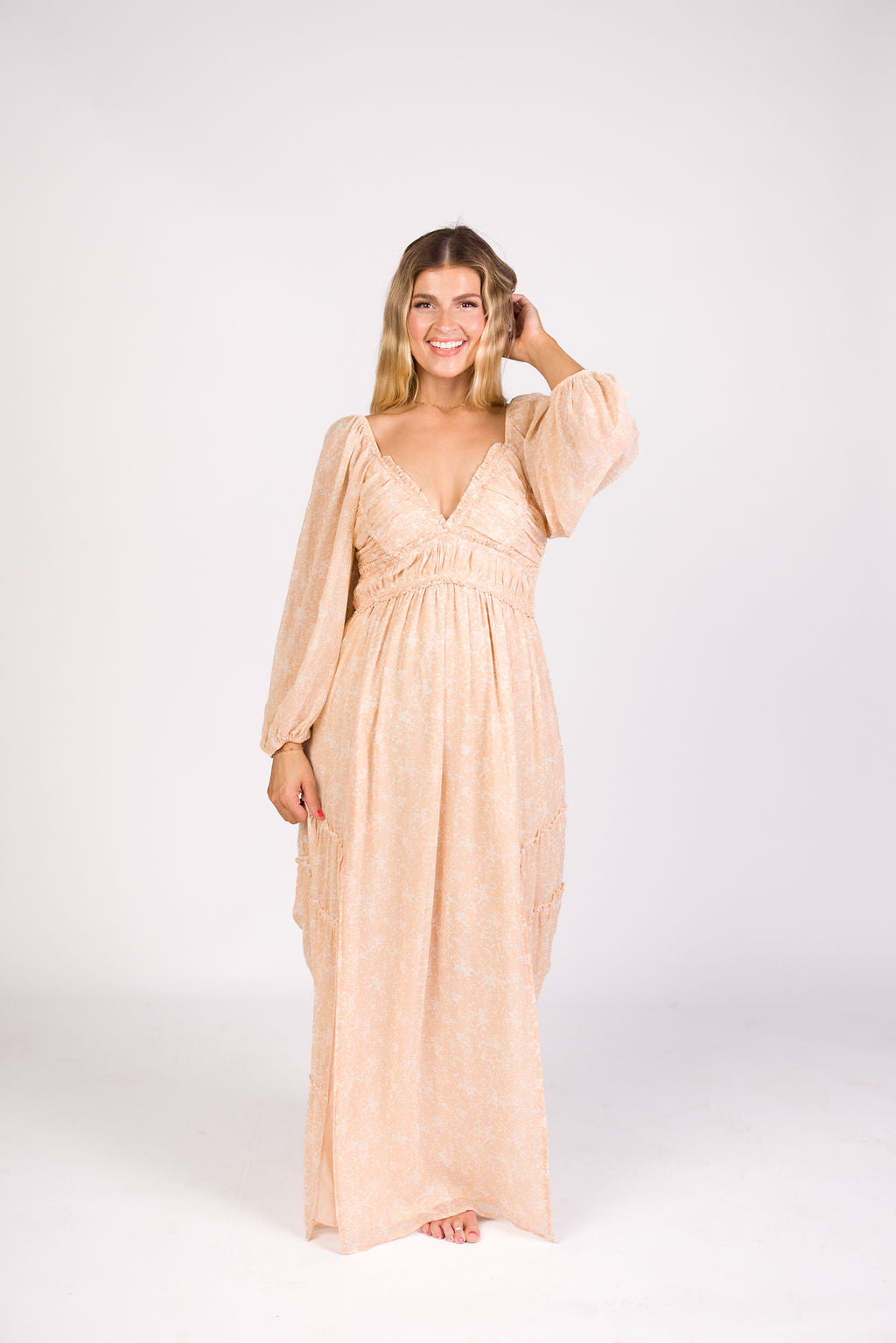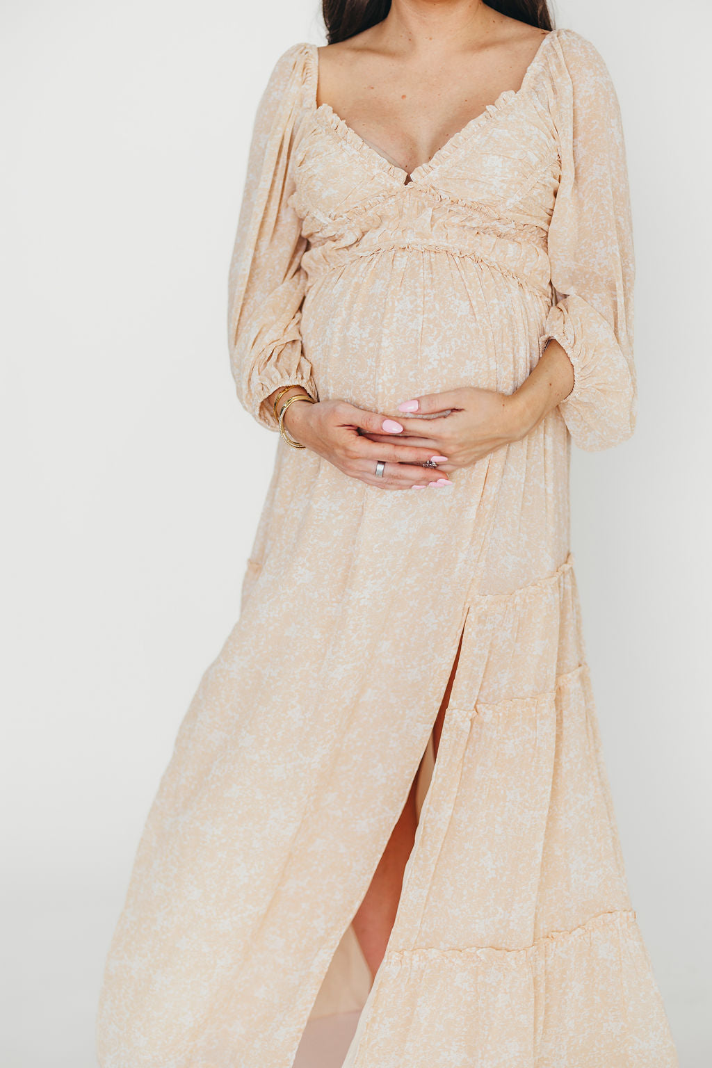 Daphne Long Sleeve Maxi Dress in Light Beige/White Floral - Bump Friendly