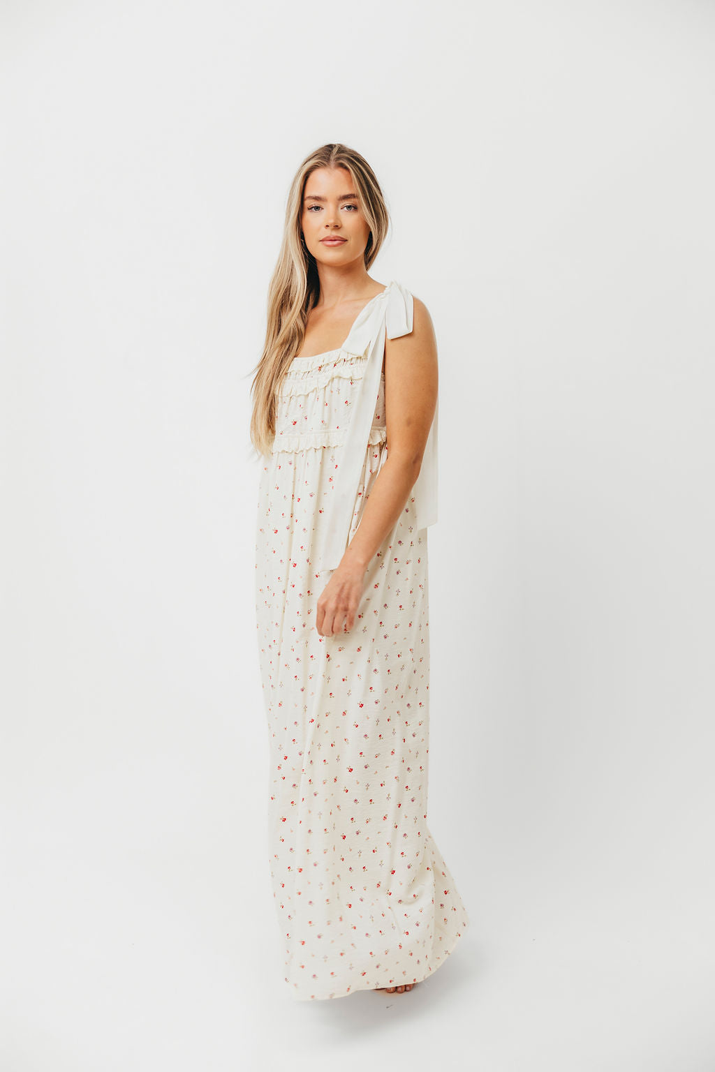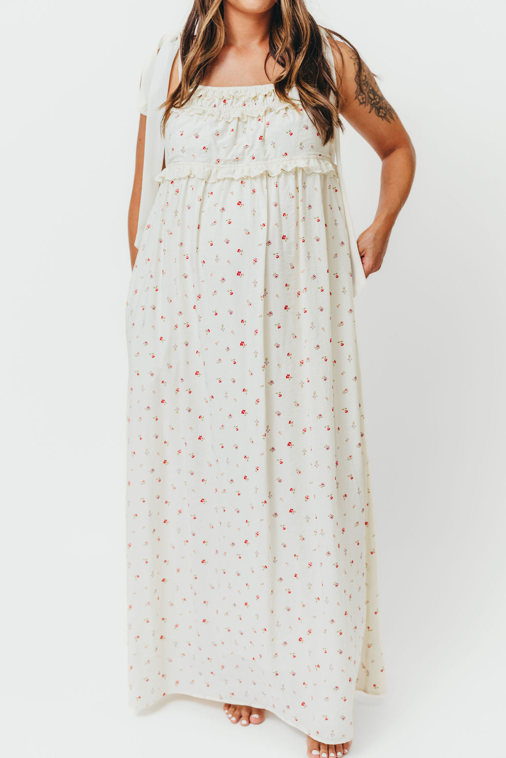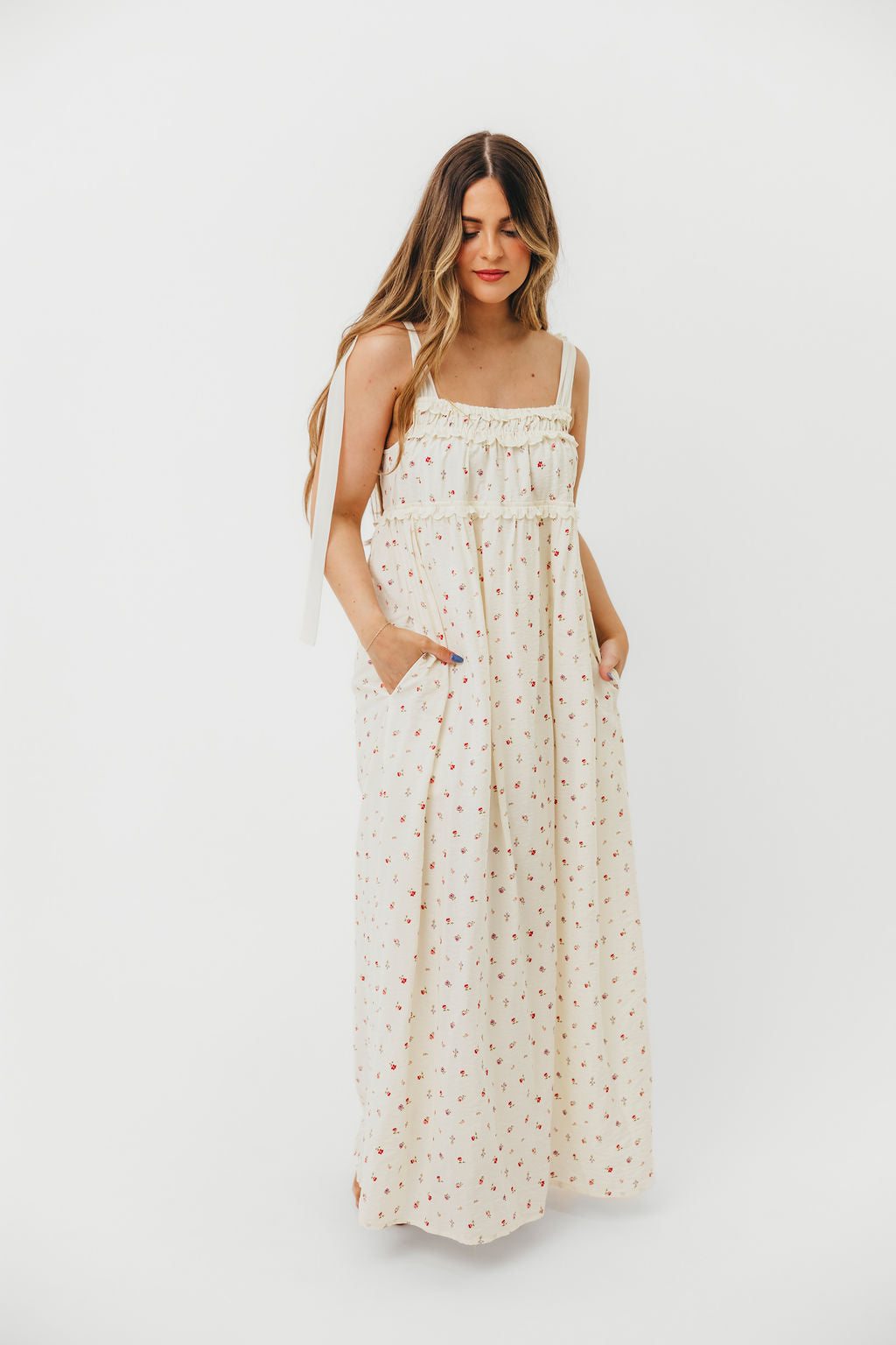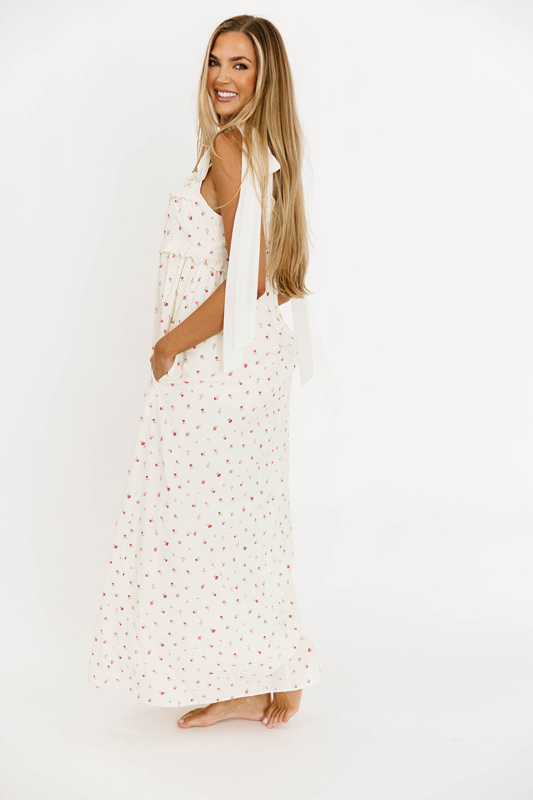 GARMENT DETAILS: Lightweight, feminine maxi dress in a dainty floral print. Features square neckline, adjustable self-tie shoulder straps, and relaxed fit with eyelet ruffle details. Finished with side pockets.