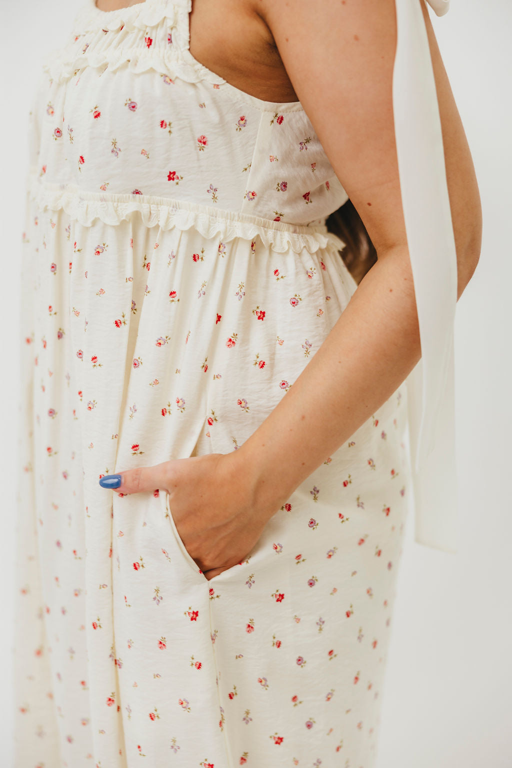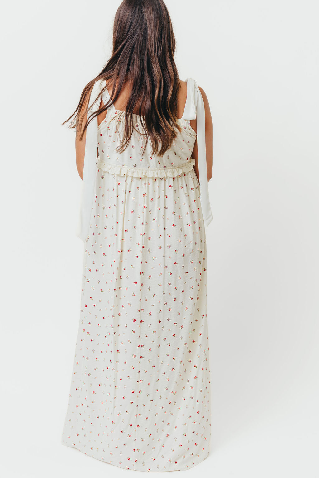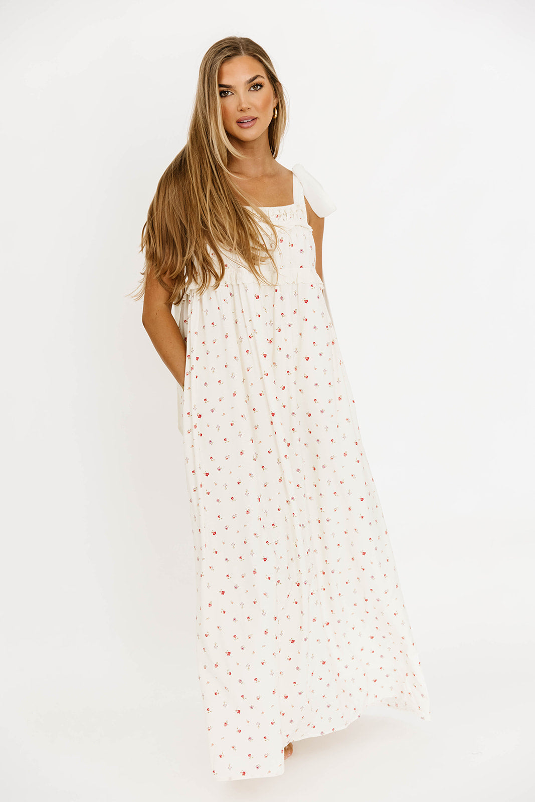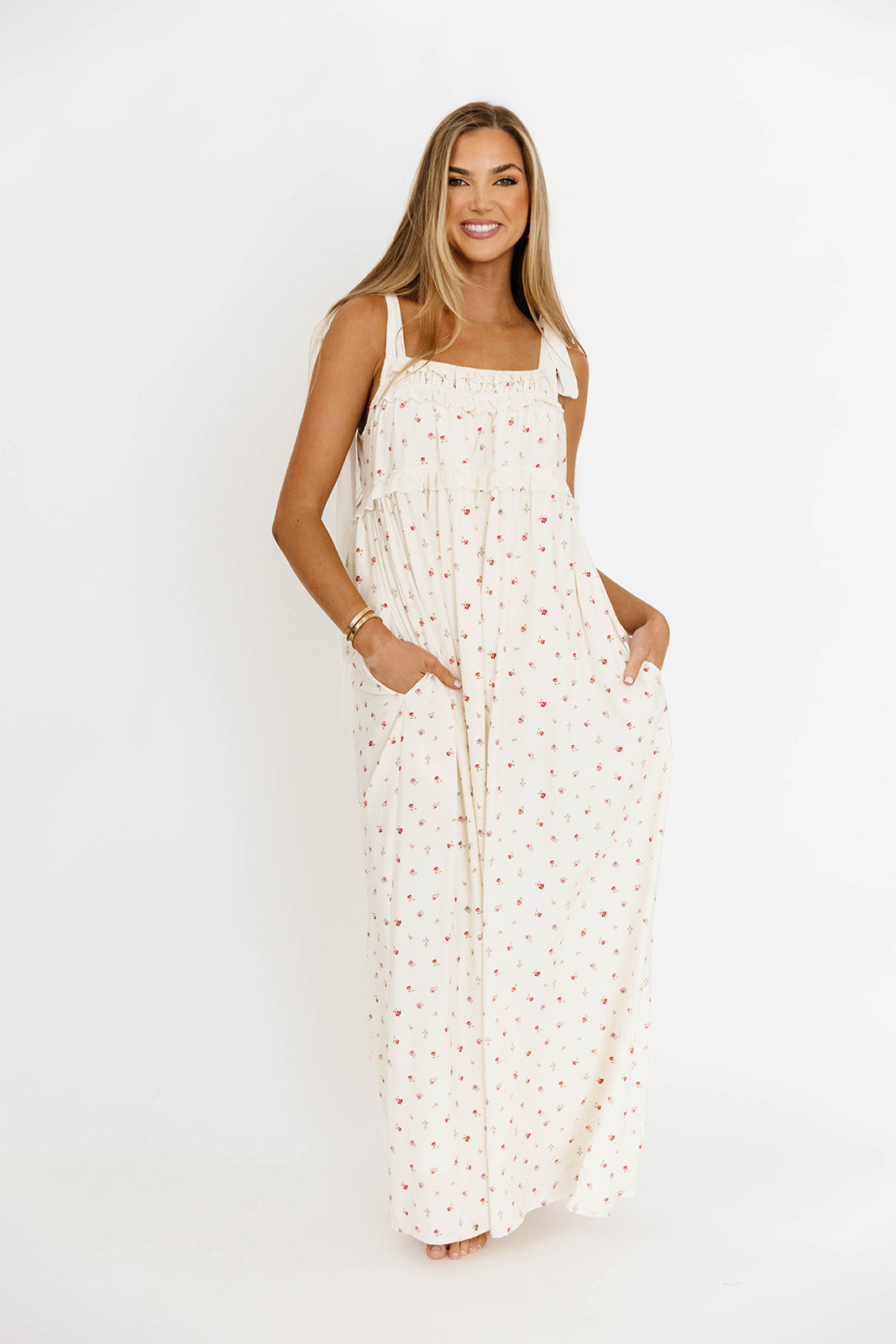 GARMENT DETAILS: Lightweight, feminine maxi dress in a dainty floral print. Features square neckline, adjustable self-tie shoulder straps, and relaxed fit with eyelet ruffle details. Finished with side pockets.