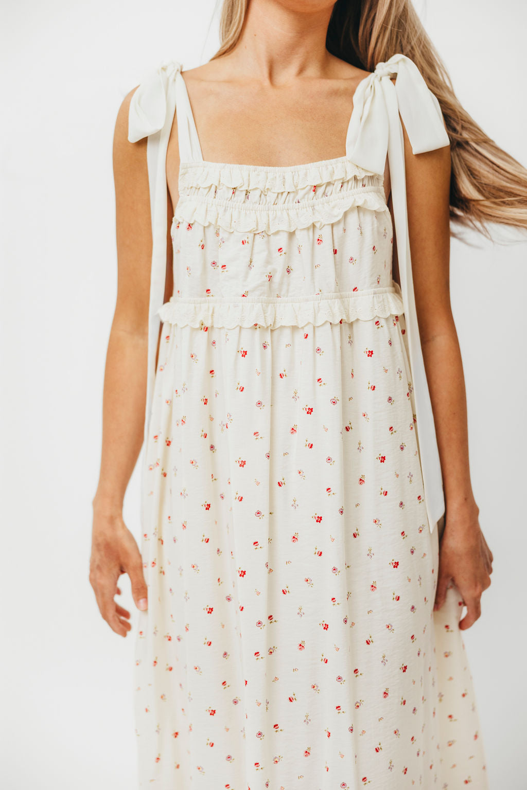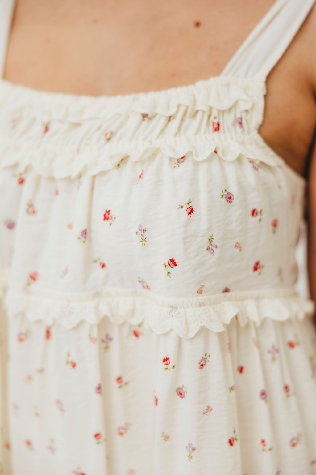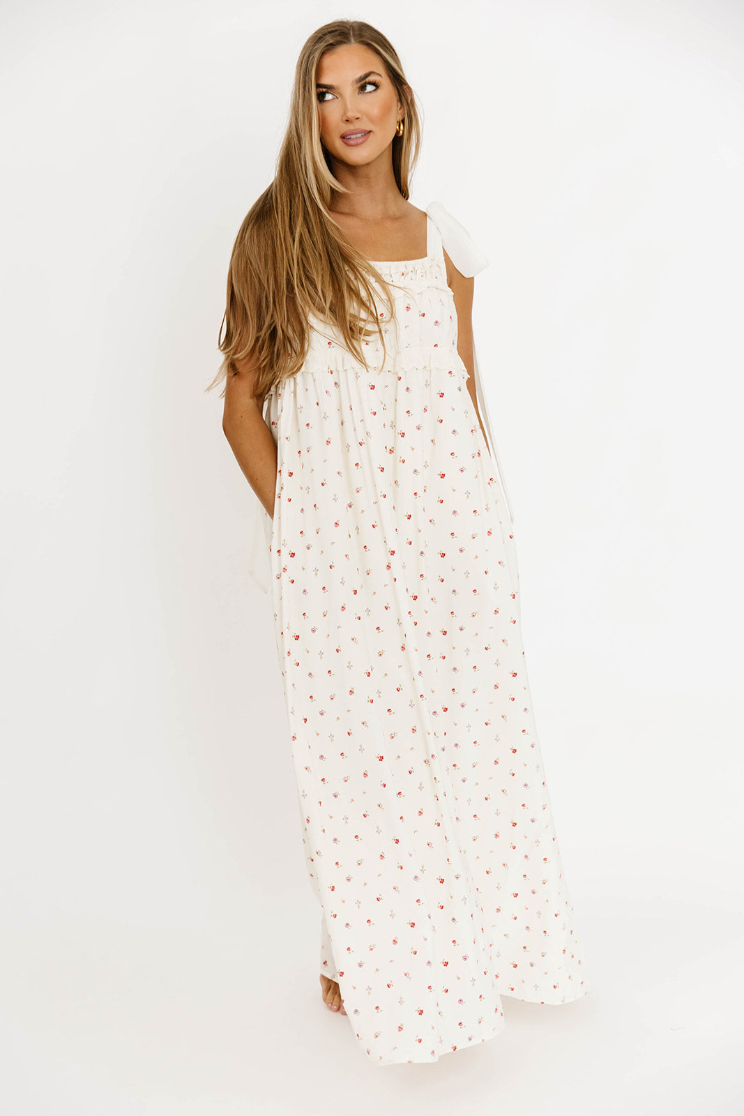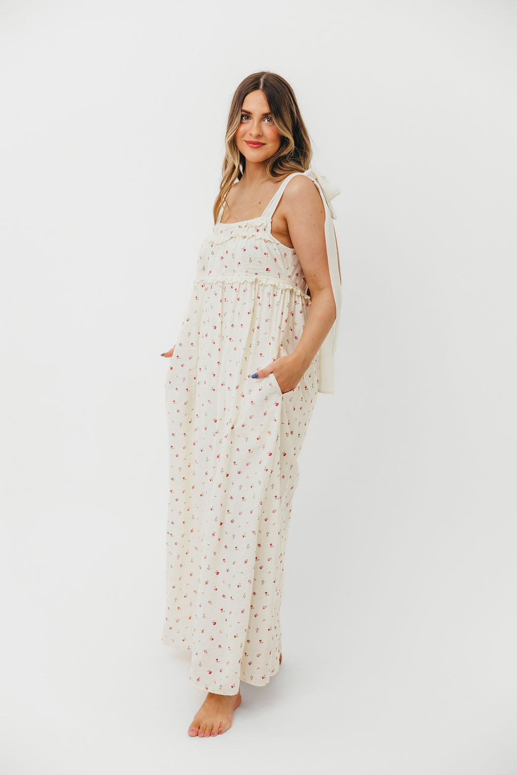 GARMENT DETAILS: Lightweight, feminine maxi dress in a dainty floral print. Features square neckline, adjustable self-tie shoulder straps, and relaxed fit with eyelet ruffle details. Finished with side pockets.