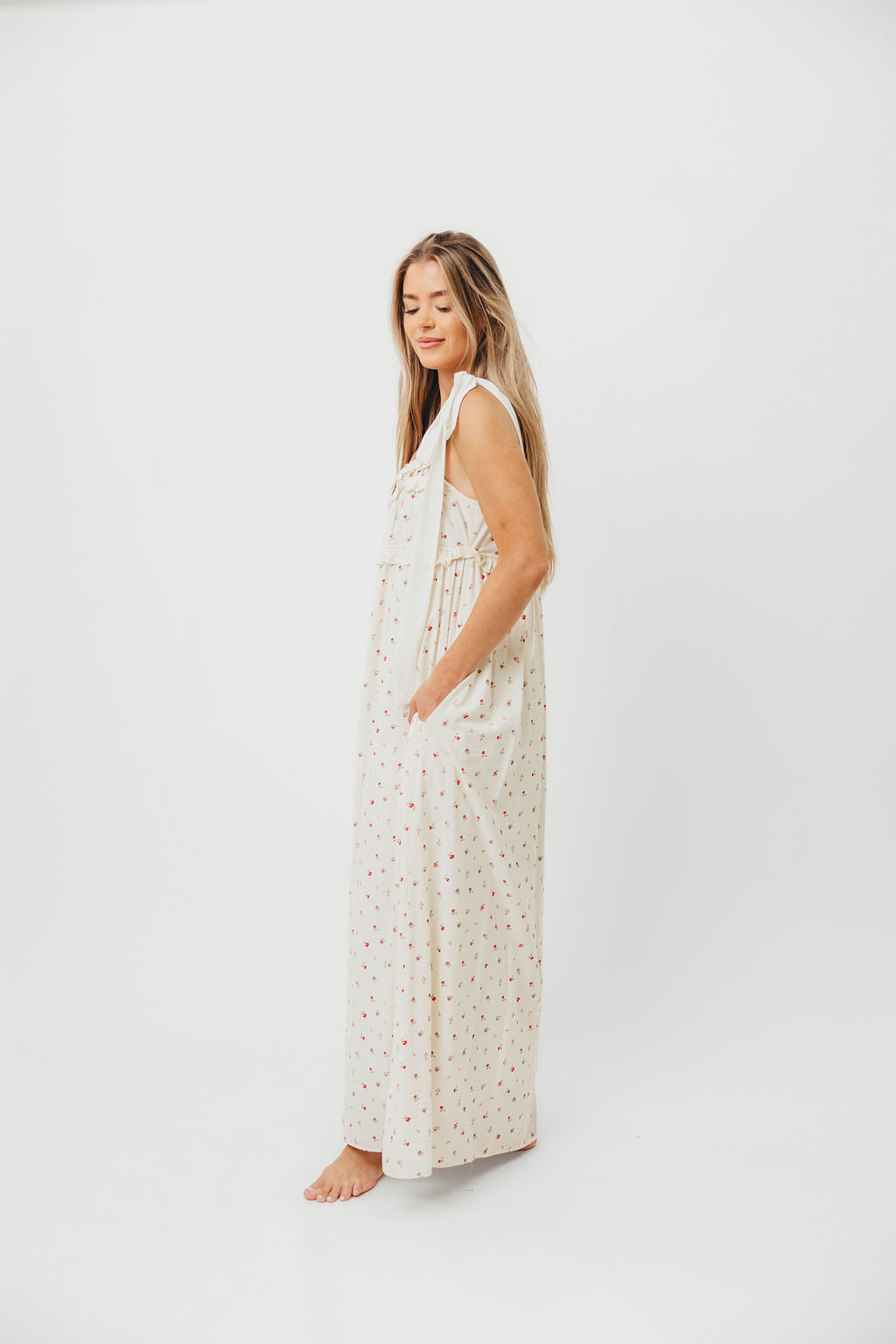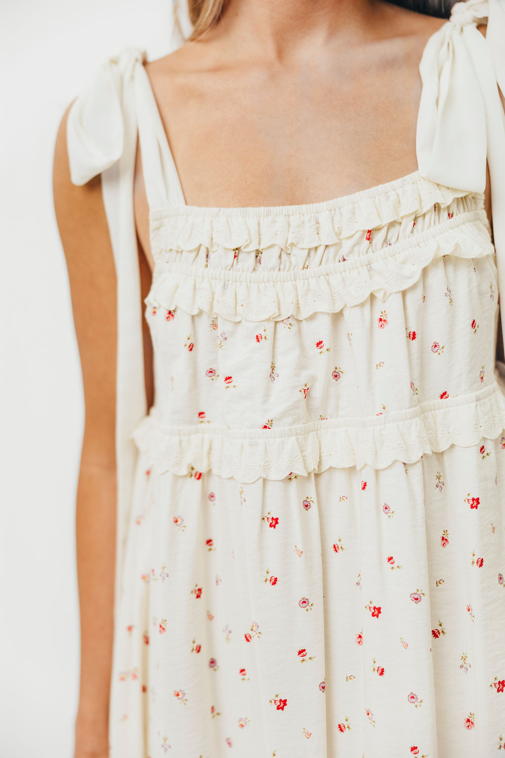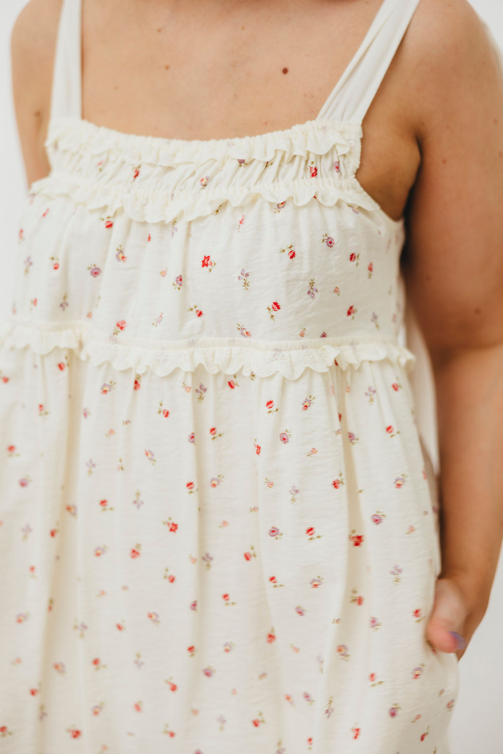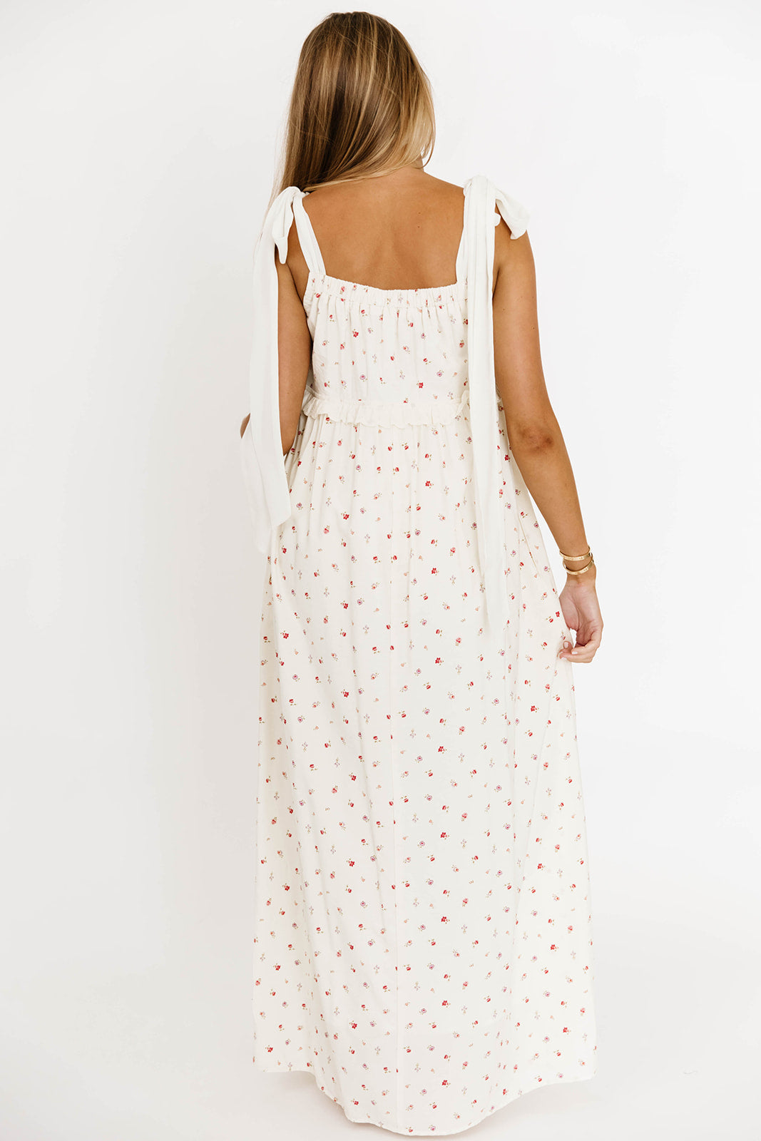 GARMENT DETAILS: Lightweight, feminine maxi dress in a dainty floral print. Features square neckline, adjustable self-tie shoulder straps, and relaxed fit with eyelet ruffle details. Finished with side pockets.