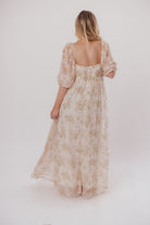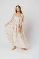 GARMENT DETAILS: Empire-waisted maxi dress in a creamy floral pattern. Features square neckline, sheer 3/4 length puffed sleeves, and bust darts, with a stretchy, smocked back panel. Lined.