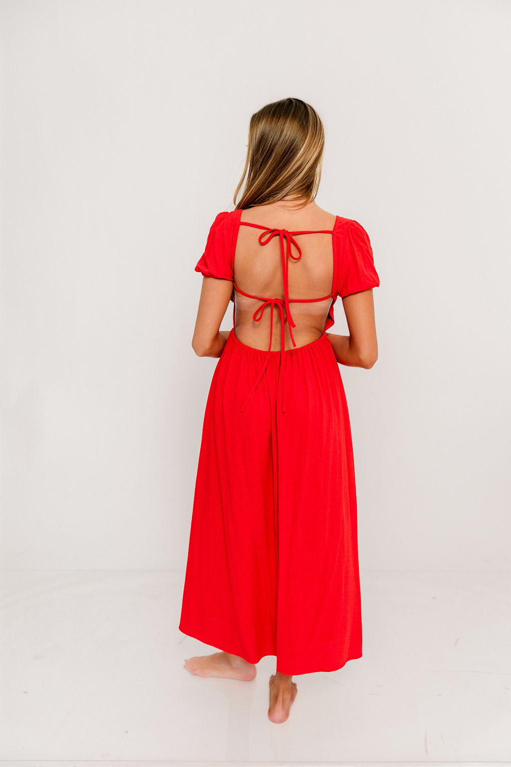 GARMENT DETAILS: Midi-length summer dress with elasticized puffed sleeves, square neckline, and stretch waist in the back. Features a statement open back with self-tie details. Lined.